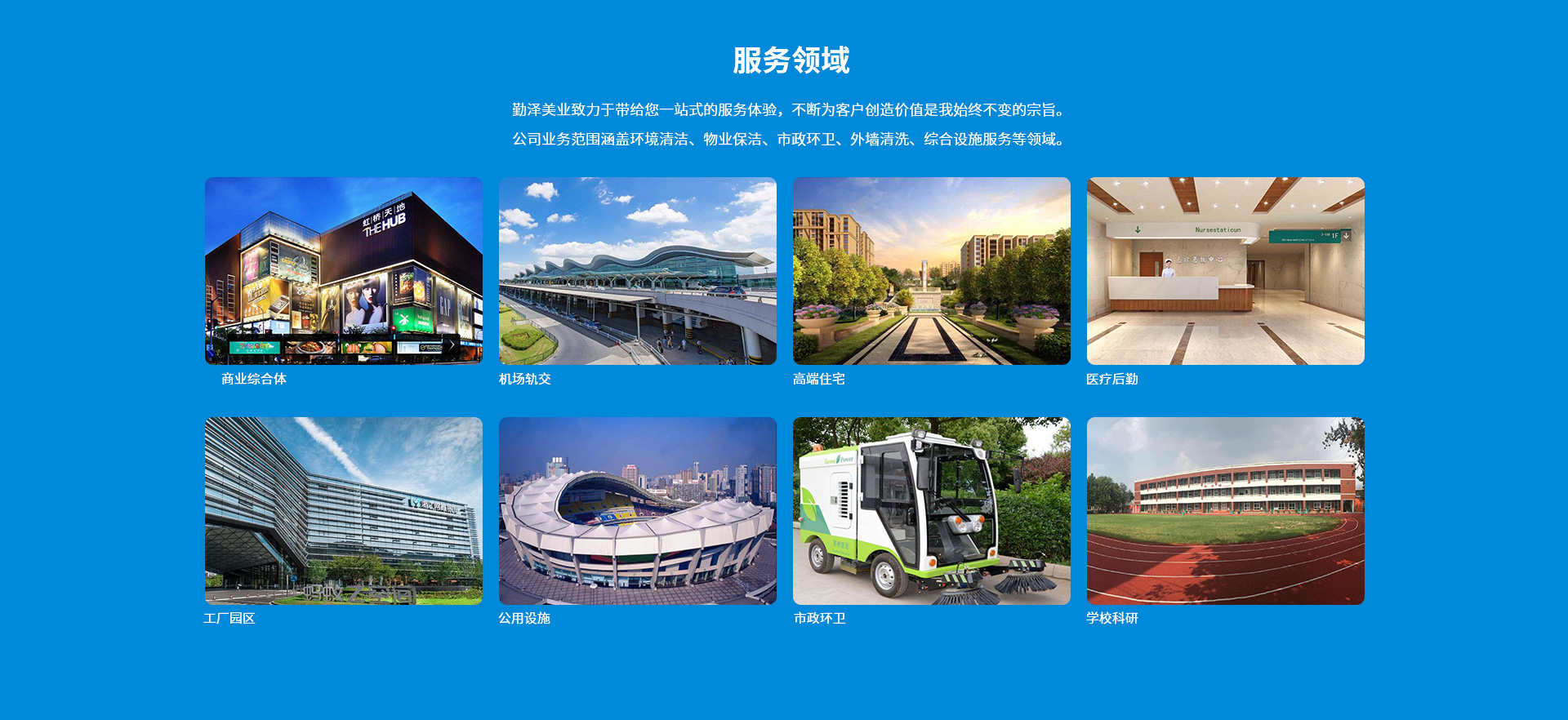 公司致力于把“勤澤美業”培育成眾口皆碑、令人尊敬、具有長期價值的服務領袖品牌。業務范圍涵蓋環境清潔和綜合設施管理服務,公司具備環衛、保潔、石材等多個行業一級資質,致力成為中國環境服務行業的領導者。